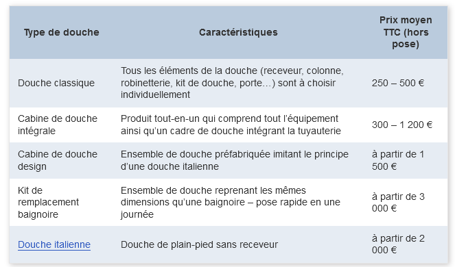 Comme vous pouvez le constater, ce tableau est très synthétique. Si vous souhaitez plus de détails sur les différents modèles cités, lisez notre article dédié aux douches.