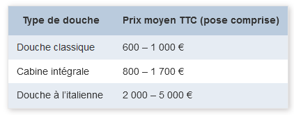 Tableau 1 : Prix moyen pour les types de douche (TTC)