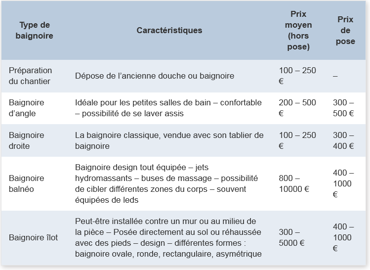 Le choix de baignoire n’est pas simple : il existe de nombreux modèles en vente sur le marché. Nous vous présentons leurs spécificités et leur prix afin de vous aider à faire le meilleur choix.