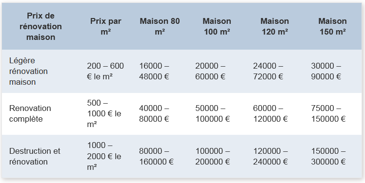 Le renouvellement d’une résidence ou d’une maison avec tous travaux liée inclus, coute à peu près 200 à 1500 €. Le renouvellement d’une se faire en plusieurs catégories différentes, et son tarif est fixer compte tenue de la superficie totale qu’il couvre. Ce prix dépend de l’ampleur des travaux entrepris.