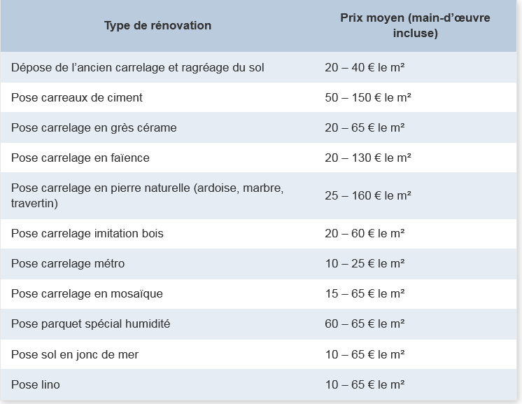 C’est une opération qui peut être coûteuse. Pour commencer, la dépose du carrelage existant au sol, ainsi que le ragréage du sol sera facturé. Ensuite, vous devrez ajouter le prix des matériaux sélectionnés (carrelage, lino ou parquet bien souvent) et aussi le tarif de pose de votre artisan.