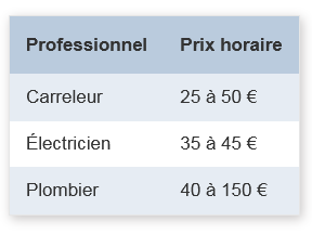 - Le tarif de l’artisan : chaque entreprise fixe son tarif horaire ou au m². Les travaux peuvent parfois requérir l’intervention d’un ou de plusieurs professionnels spécialisés, le plombier, le peintre, le carreleur, l’électricien etc. Plus le nombre d’intervenants sera important, plus la facture sera élevée.