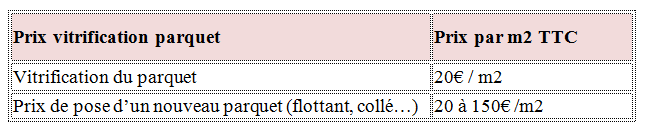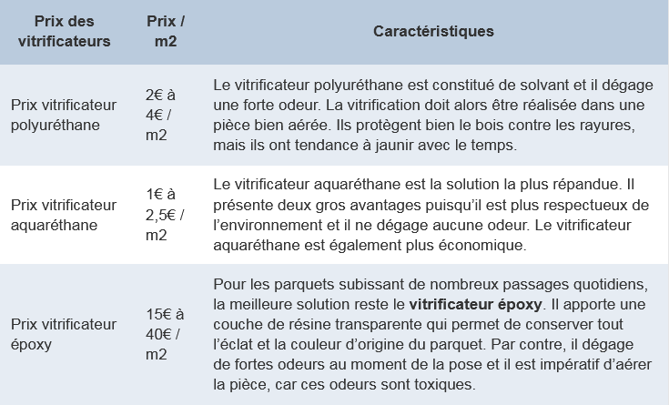 Le prix de la vitrification des parquets a un prix moyen de 25 € le m2. Les principaux vitrifiants sont le polyuréthane, l’aquaréthane et l’époxy ; ce dernier est nettement plus cher (jusqu’à 40 €/m2) en moyenne. Le processus de vitrification offre une protection contre l’abrasion, les rayures et les chocs.